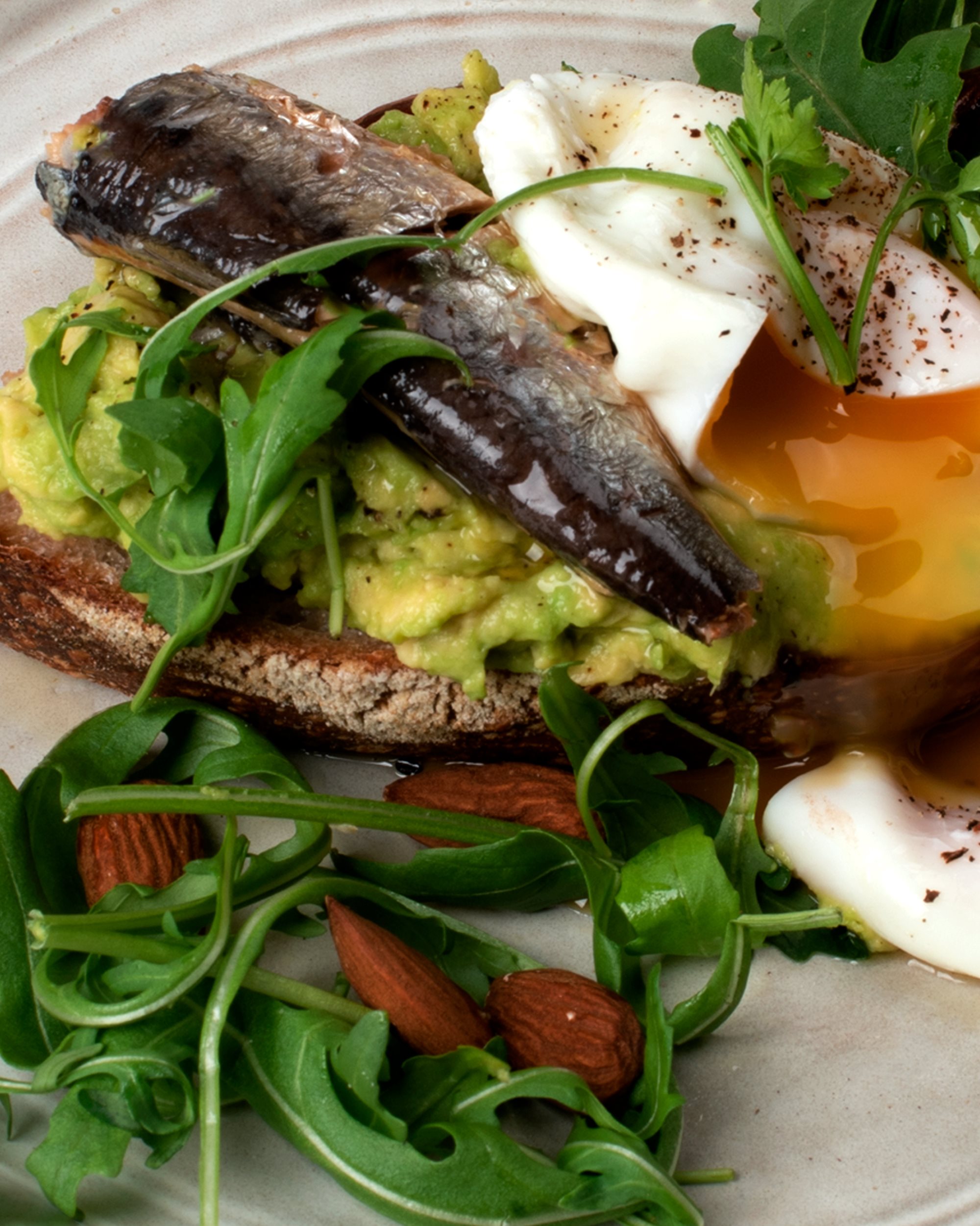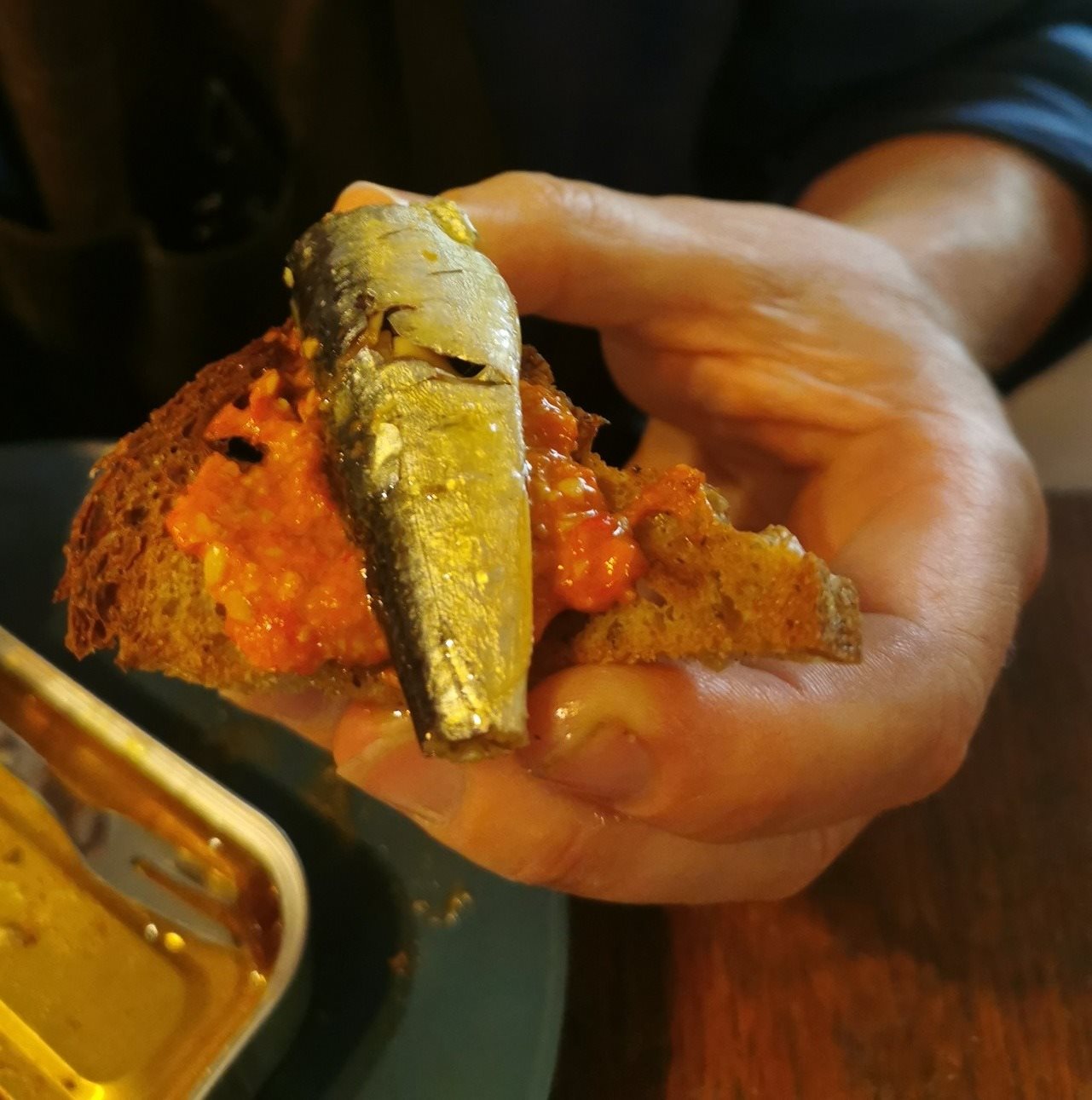 Serveringsforslag: Vi serverer sardinerne til et glas Tawny portvin med lidt alder, f.eks. Quinta do Novals 20-årige Tawny. Man kan godt lægge lidt peberfrugtpesto under sardinerne (se billede med Torbens hånd).