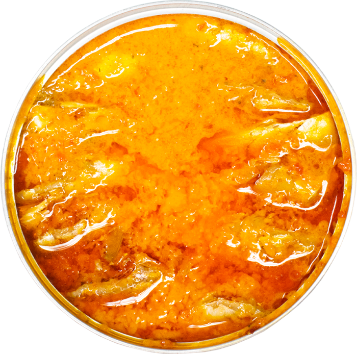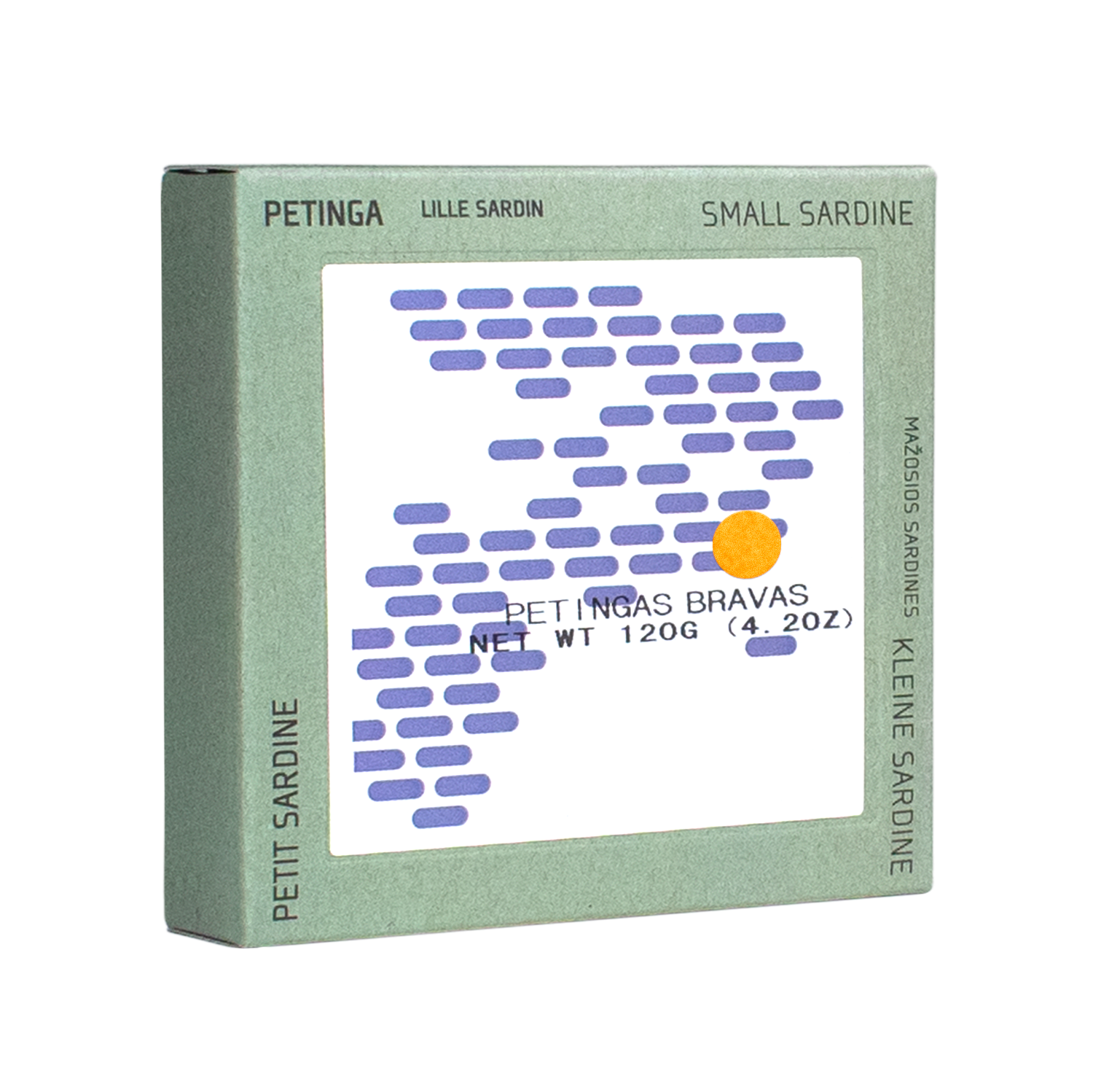 Fine små saftige sardiner (sardina pilchardus), fanget i det Nordøstlige Atlanterhav på bæredygtig vis og én for én lagt i brava-sovs. Denne dåse vandt Sofi-prisen i 2023 som bedste nye fiske-produkt.